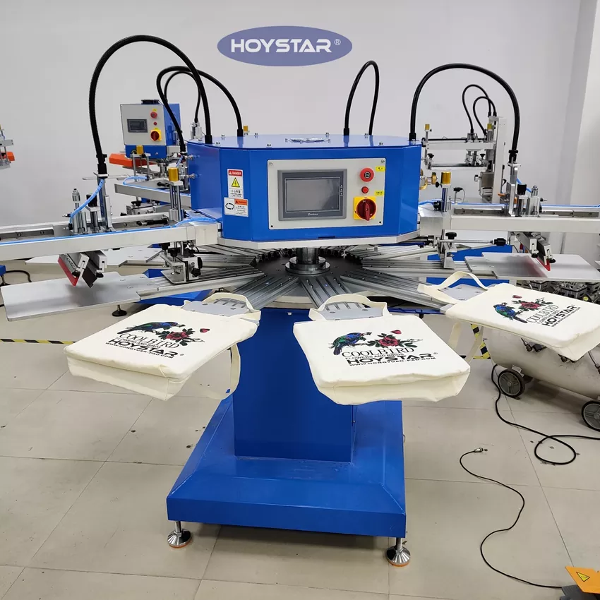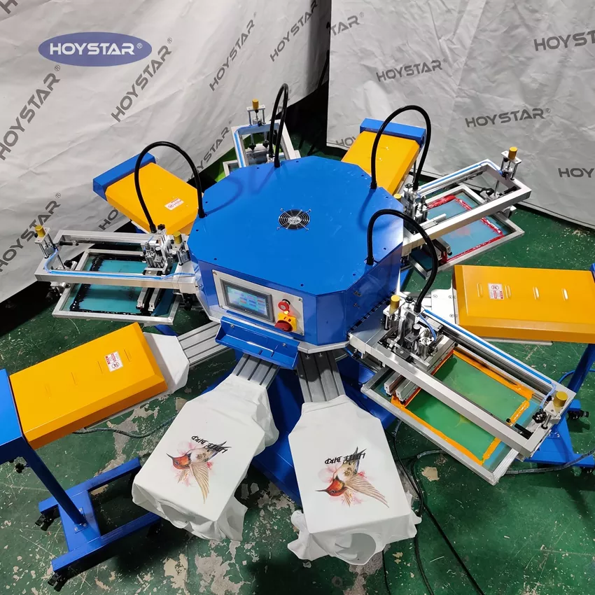 ပရော်ဖက်ရှင်နယ် ထုတ်လုပ်သူနှင့် ပေးသွင်းသူအနေဖြင့်  ဤ HOYSTAR အလိုအလျောက် 4 ရောင်စုံအိတ် တီရှပ် စကရင်ပုံနှိပ်စက်စက်ကို အထည်အလိပ်လုပ်ငန်းအတွက် အထူးဒီဇိုင်းထုတ်ထားပါသည်။ တစ်နာရီလျှင် 1200 အပိုင်းအထိ စွဲမက်ဖွယ်ထွက်ရှိမှုနှင့်အတူ သင့်ထုတ်လုပ်မှုကို ထိရောက်စွာ မြှင့်တင်နိုင်ပါသည်။ အထည်အလိပ်တံဆိပ်များ၊ အညွှန်းများနှင့် အိတ်များ ပုံနှိပ်ခြင်းအတွက် ဒီဇိုင်း၊ အမျိုးမျိုးသော ထုတ်ကုန်အမျိုးအစား ပုံနှိပ်ခြင်းအတွက် တန်ဆာပလာကို ပြောင်းလဲနိုင်သည်။ စက်တွင် လျင်မြန်ပြီး အဆင်ပြေစွာ သယ်ဆောင်ခြင်းနှင့် ဖြုတ်ချခြင်းကို ခွင့်ပြုသည့် rotary worktable ပါရှိသည်—စက်ရပ်ချိန်ကို နည်းပါးစေပြီး ပမာဏကို အများဆုံးဖြစ်စေသည်။